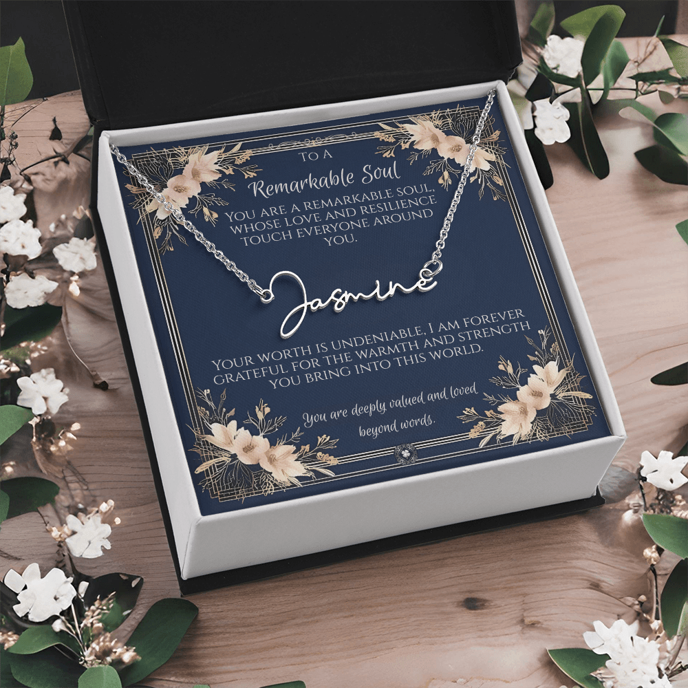 I bought a personalized cursive name necklace for my friend's birthday and it was super cute, elegant and feminine with minimalist styling, her name looks gorgeous in cursive and I got to put my custom name on the message card itself, which was the most excellent personal touch, she really loved it, it feels well made and good quality not like Temu or cheap China stuff, I know I definitely gave the best gift with this one and I’ll definitely be back for more.