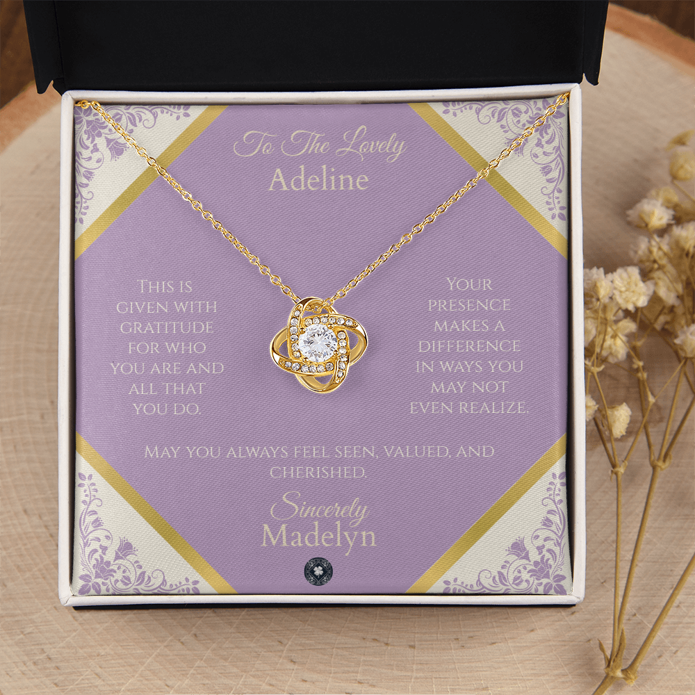 Celebrate the unbreakable bond between two souls with our exquisite "Love Knot" necklace, an enduring symbol of connection and devotion. Crafted with precision, this striking piece is offered in 14-karat white gold over stainless steel or 18- karat yellow gold over stainless steel, featuring a captivating 6 mm round-cut cubic zirconia stone that radiates timeless brilliance. Resting on a delicate cable chain adjustable from 18 to 22 inches with a secure lobster clasp, it effortlessly combines elegance with meaningful symbolism. Whether worn as a daily reminder of love or a treasured gift, this necklace embodies strength, unity, and the beauty of enduring affection~ because some bonds are truly forever.