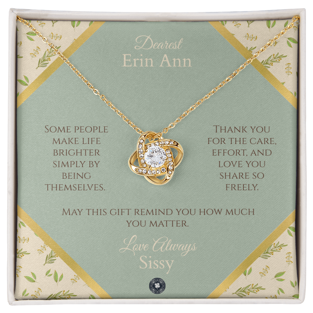Love Knot Necklace: Personalized Sage Boho Message Card